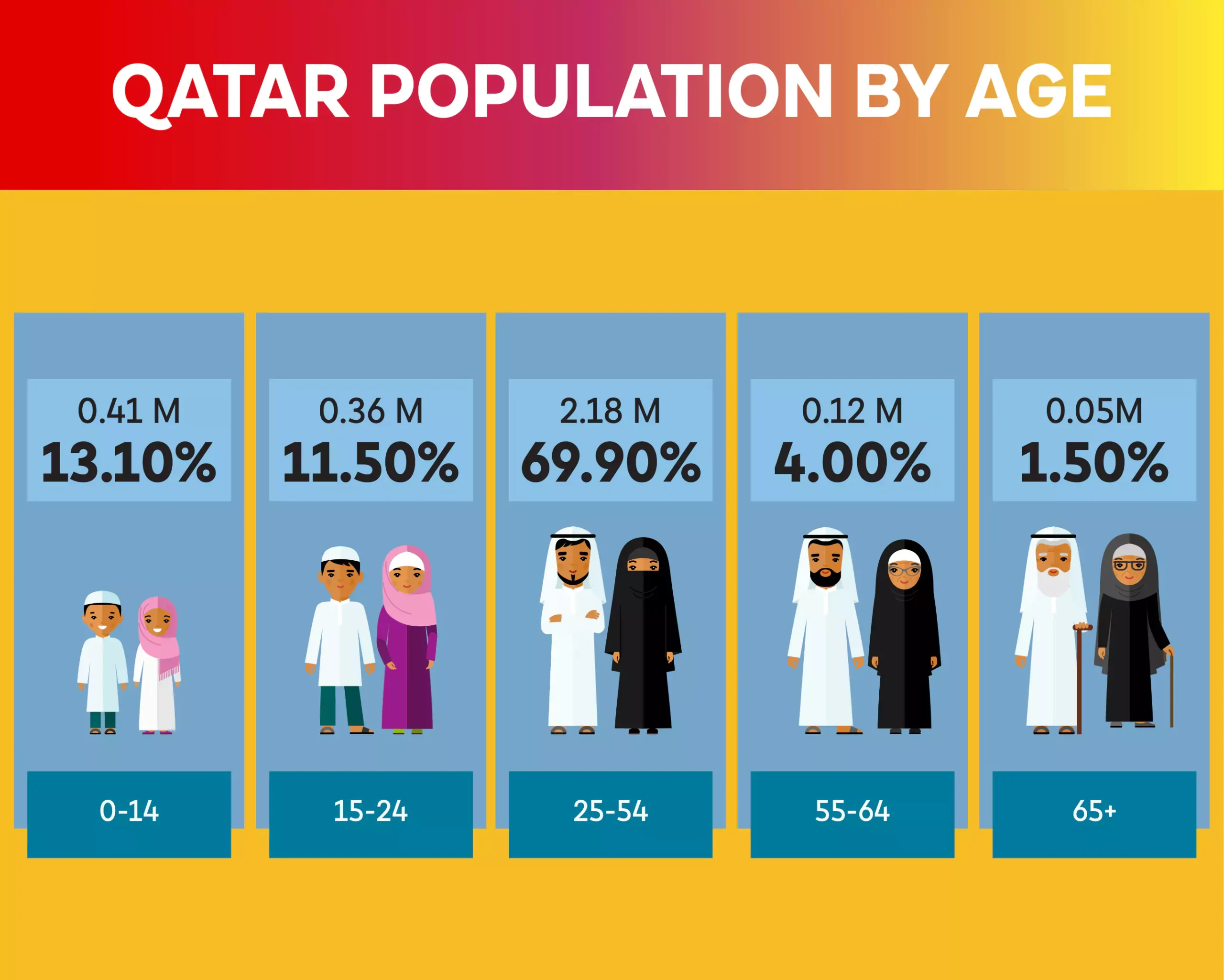 The elderly population in Qatar, while still a smaller segment compared to younger age groups, is steadily increasing as life expectancy rises due to advancements in healthcare. Qatar has one of the highest life expectancies in the Middle East, thanks to the availability of world-class medical services and a high standard of living.